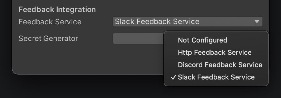 Feedback Integration セクションの Feedback Service ドロップダウンから、Slack Feedback Service を選択します。その後、Secret Generator の Open ボタンをクリックして生成ツールを開きます。
