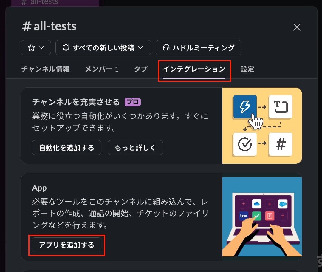 「インテグレーション」タブを開き、アプリを追加する をクリックします。