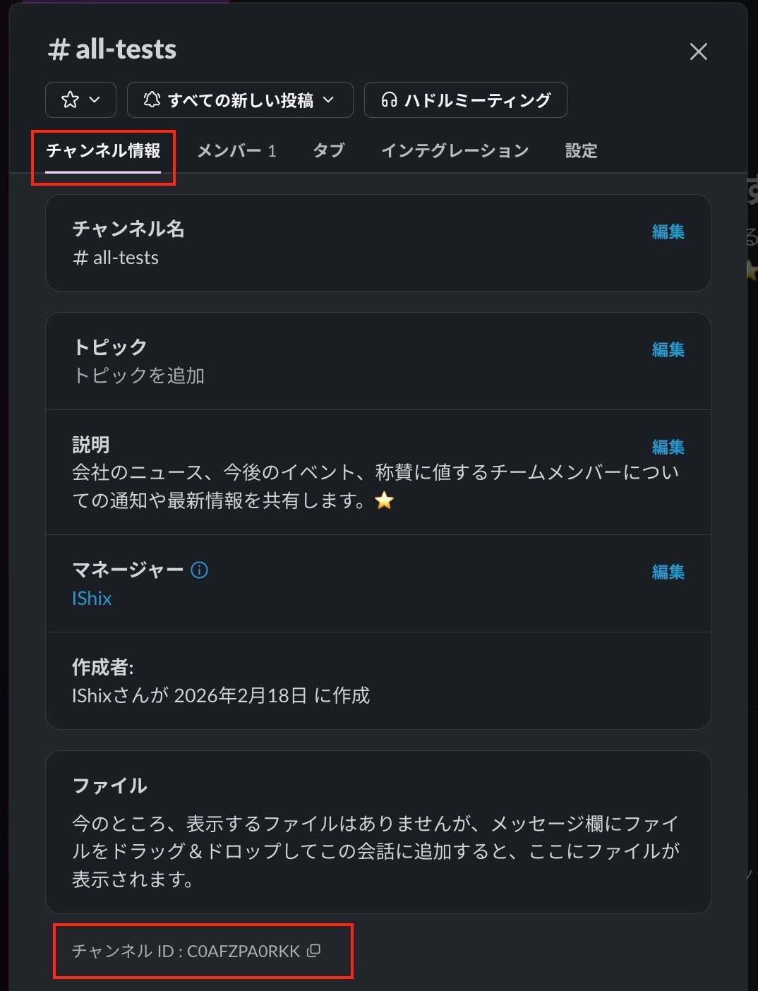 同じくチャンネル詳細画面の一番下にある チャンネル ID(例:C12345678)をコピーして控えておきます。