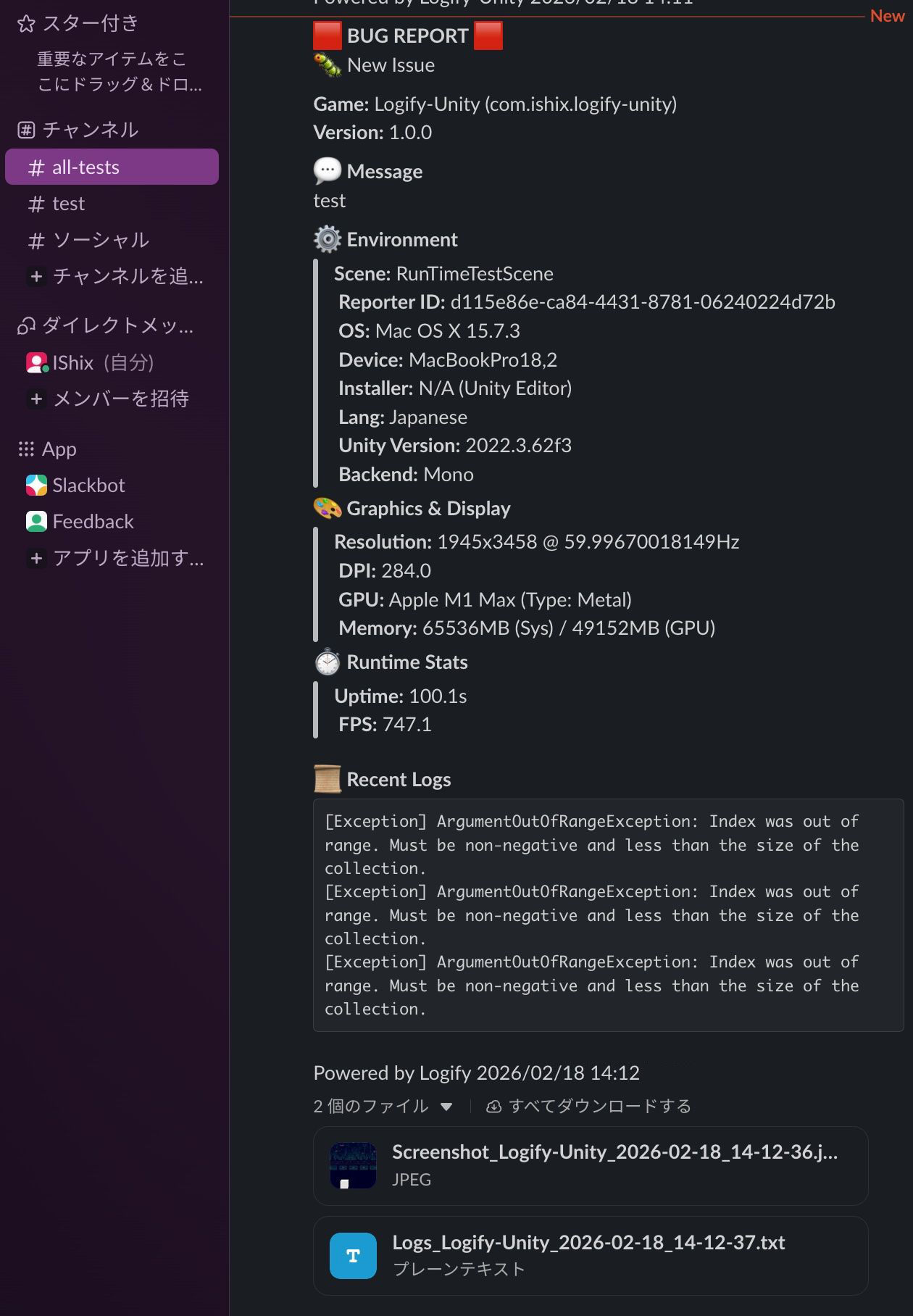 - 指定した Slack チャンネルに、デバイス情報と共にメッセージが届いていることを確認してください。