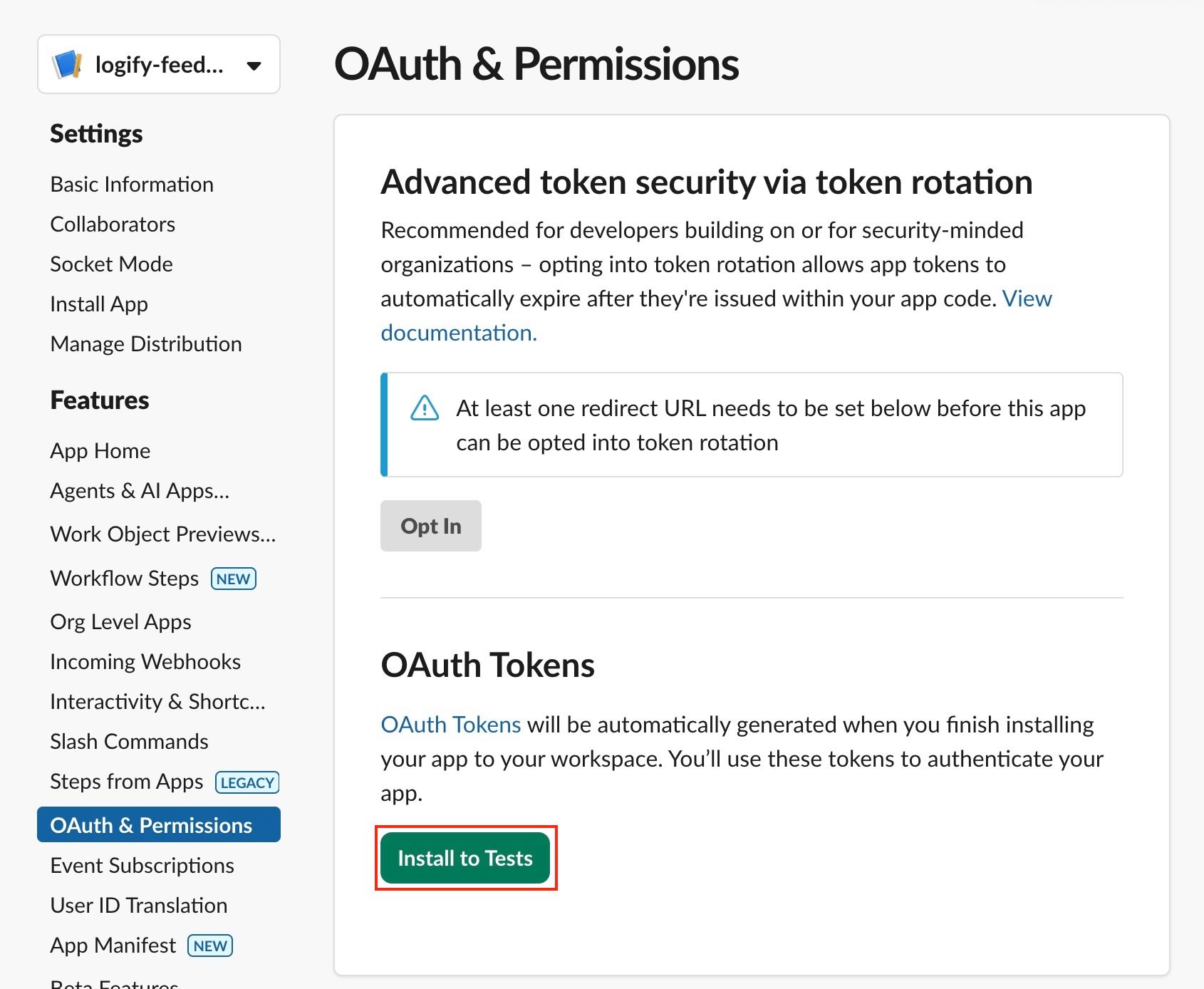 左側メニューの OAuth & Permissions を開き、Install to [ワークスペース名] をクリックします。