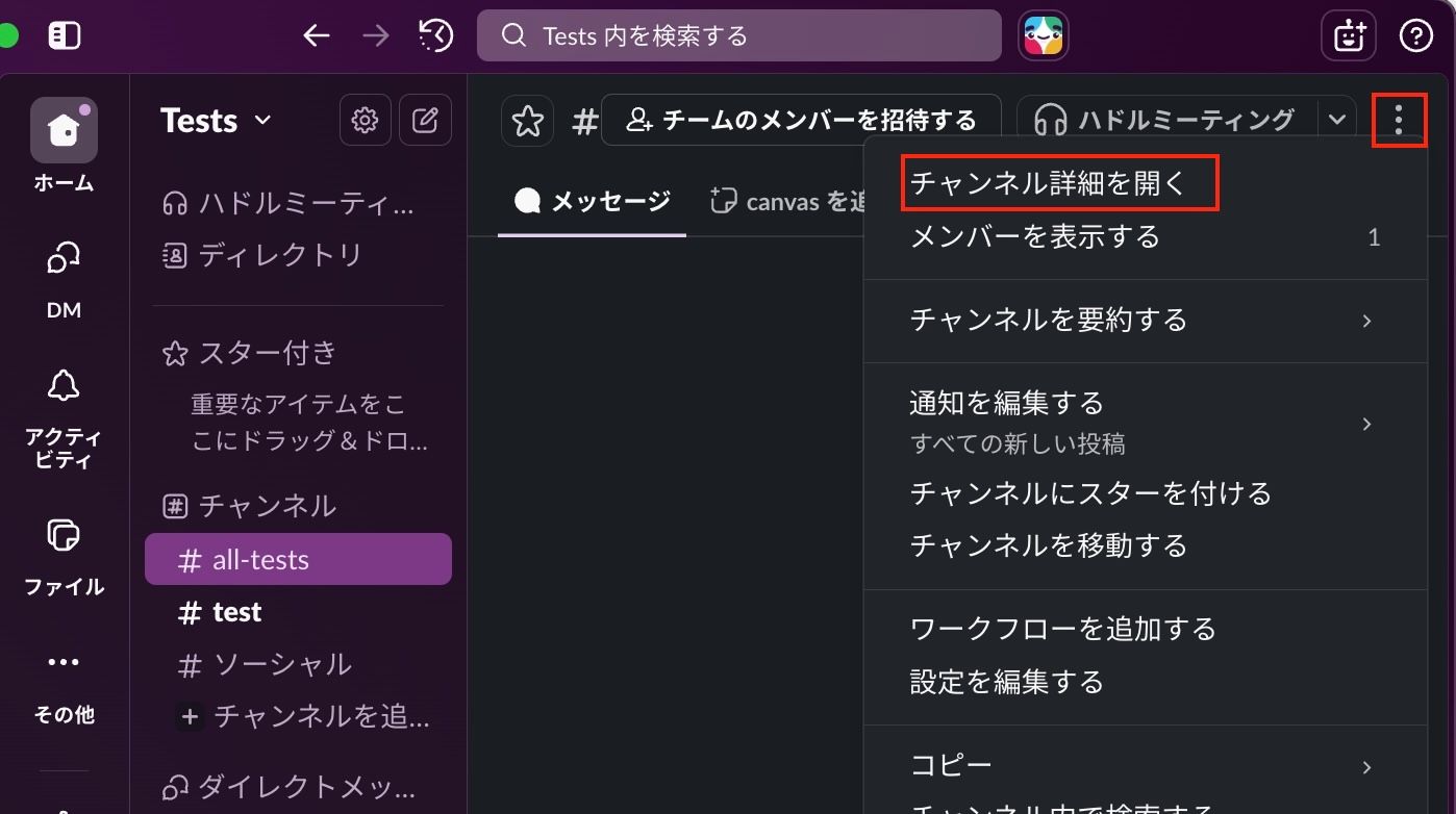 Slack アプリでフィードバックを受信したいチャンネルを開き、右上の詳細アイコンをクリックします。
